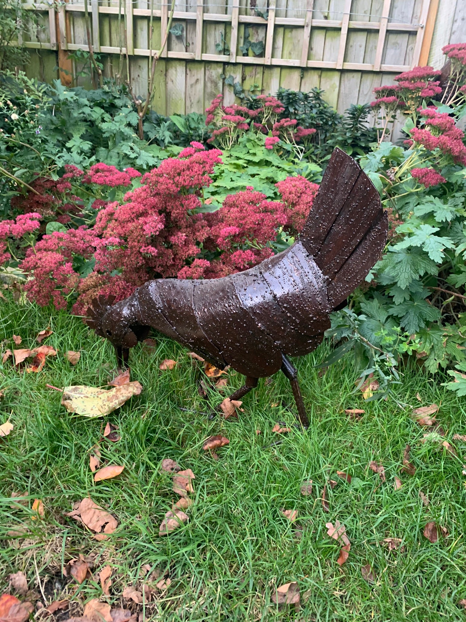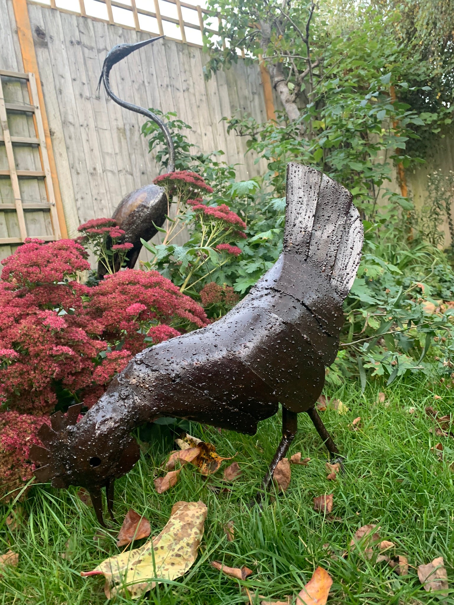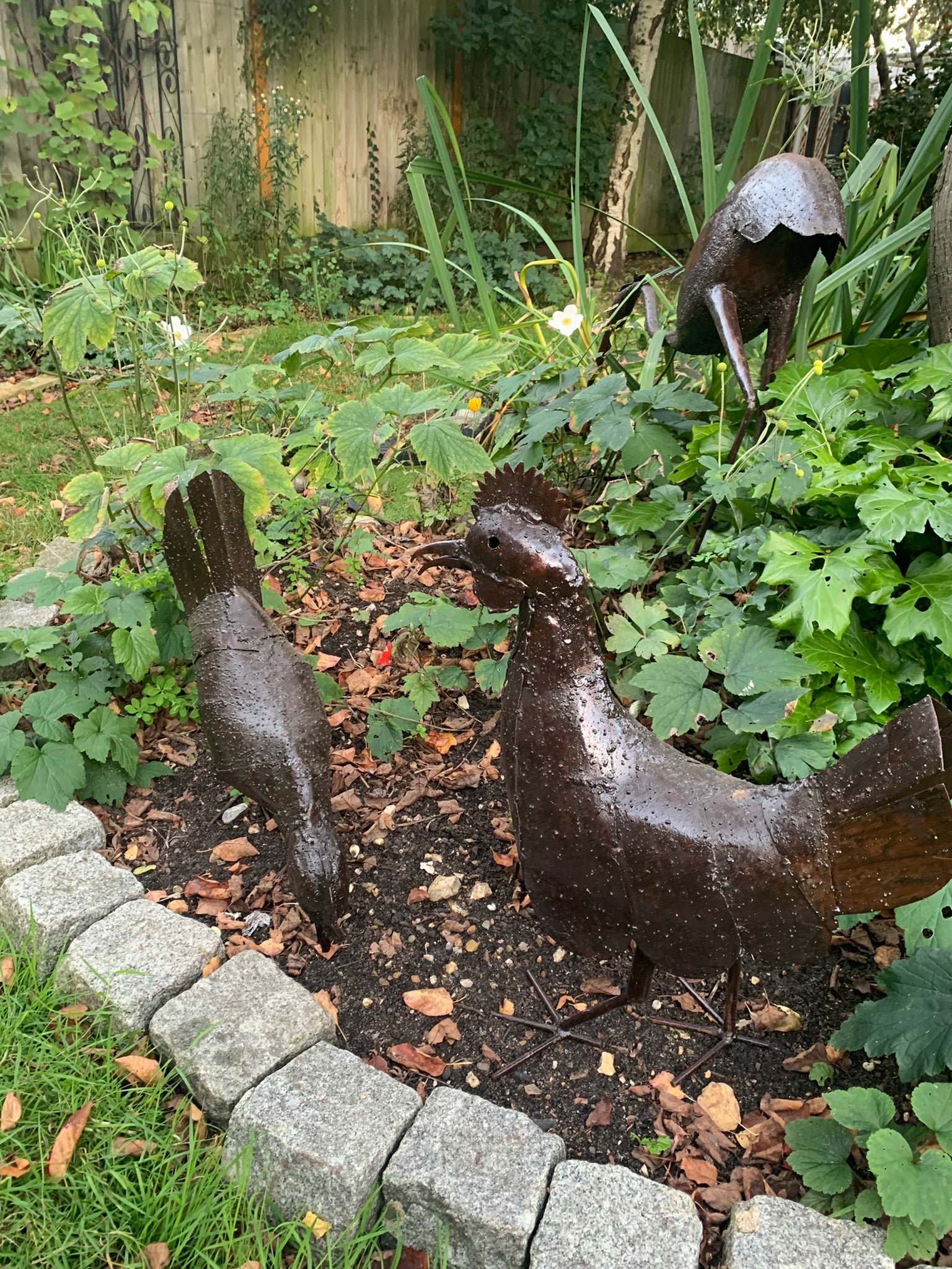 Handsome metal cockerel or rooster and delightful hen.